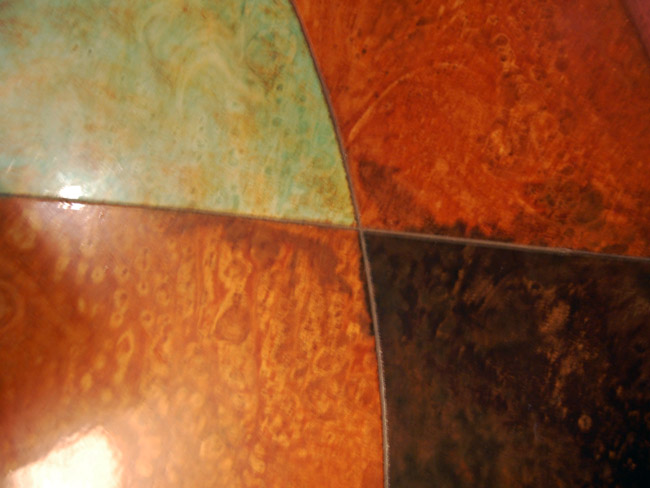 The geometric patterns and artistic shapes of the decorative concrete design were mapped out on the floor and then decorative saw cuts were performed to provide delineation points between the different shapes and colors.