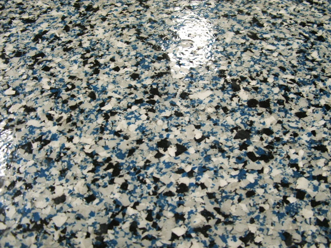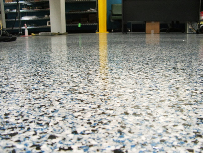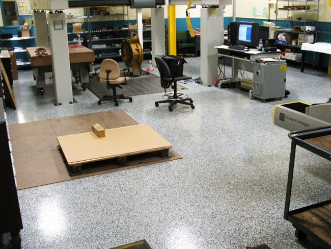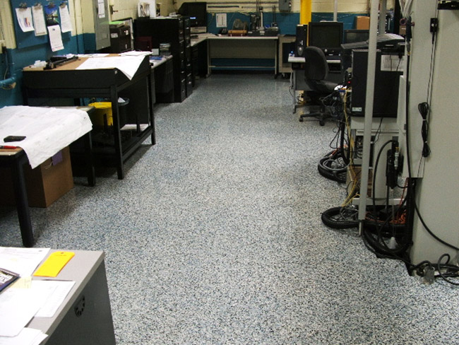 First this manufacturing clients concrete floors were mechanically steel shot blast, then the concrete control joints were diamond saw cut and filled.The concrete surface was then patched and repaired utilizing fast patch epoxy patching kits and the patches were troweled smooth and level.100% solids epoxy primer coat was applied and then a base coat of 100% solids epoxy concrete resurfacing epoxy was applied and the epoxy base coat was broadcast to full rejection with Decorative Flake. These Decorative Flakes are specially engineered to be compatible with epoxy to provide a beautiful and unique look to the floor. Once the first coat of Decorative Epoxy Flake was applied, a second coat of 100% solids epoxy resurfacing system was installed and another full broadcast of the epoxy decorative flake was performed.