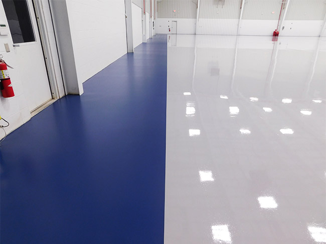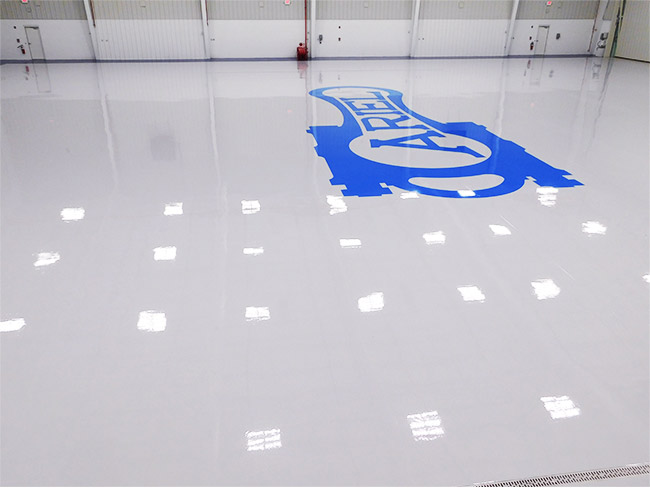 The client decided on a CUSTOM GRAY colorant for the body of floor in High Gloss, with a custom blue colorant pedestrian aisle way in a satin finish and to really make a statement a 55’ foot long custom, hand placed, hand designed logo in a secondary custom blue colorant…that Is not a type…a 55-foot long logo!