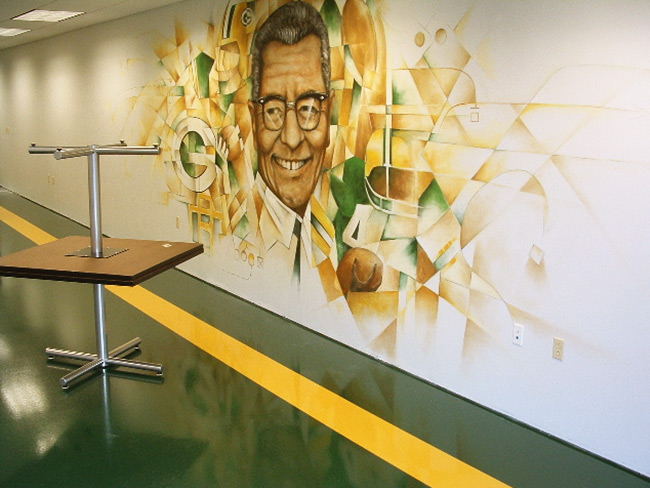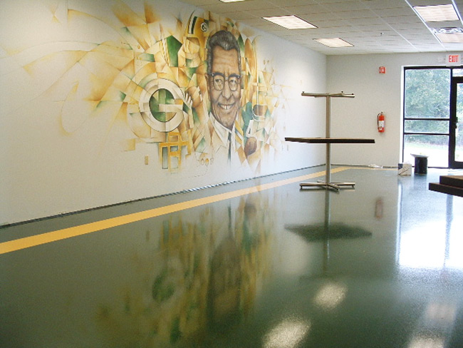 This Milwaukee area manufacturer had their employee’s vote on a theme and they selected a Green Bay Packers inspired floor and mural for their break room.